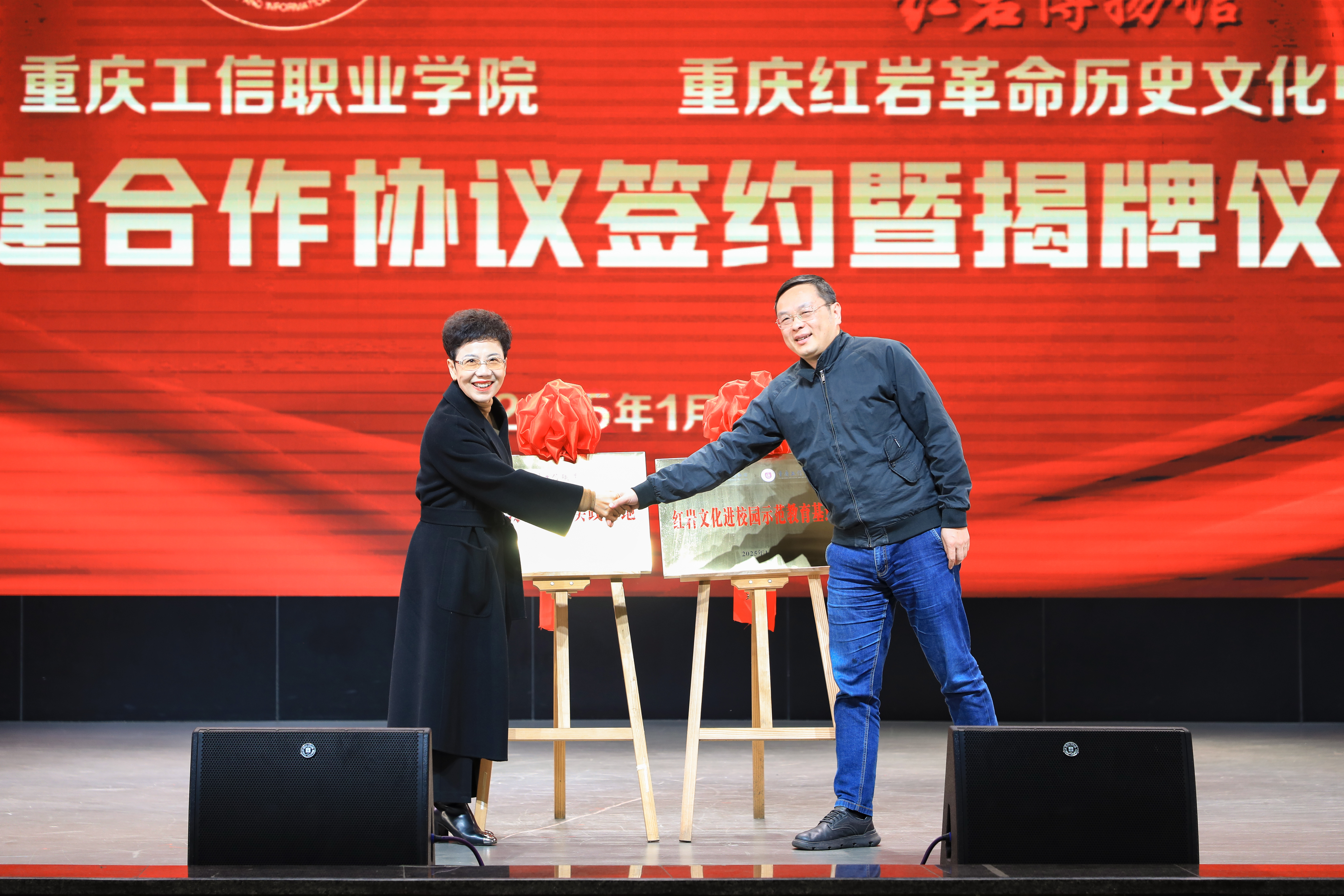 签约仪式上,学校马克思主义学院负责人李琪和红岩革命历史文化中心宣教处副处长罗雪代表双方单位郑重签约。学校党委副书记、院长杜宏伟和红岩革命历史文化中心党委委员、副主任黄振伟共同为“红岩文化进校园示范教育基地”“重庆工信职业学院思政教育研学实践基地”揭牌,仪式在全校教职工热烈的掌声中结束。