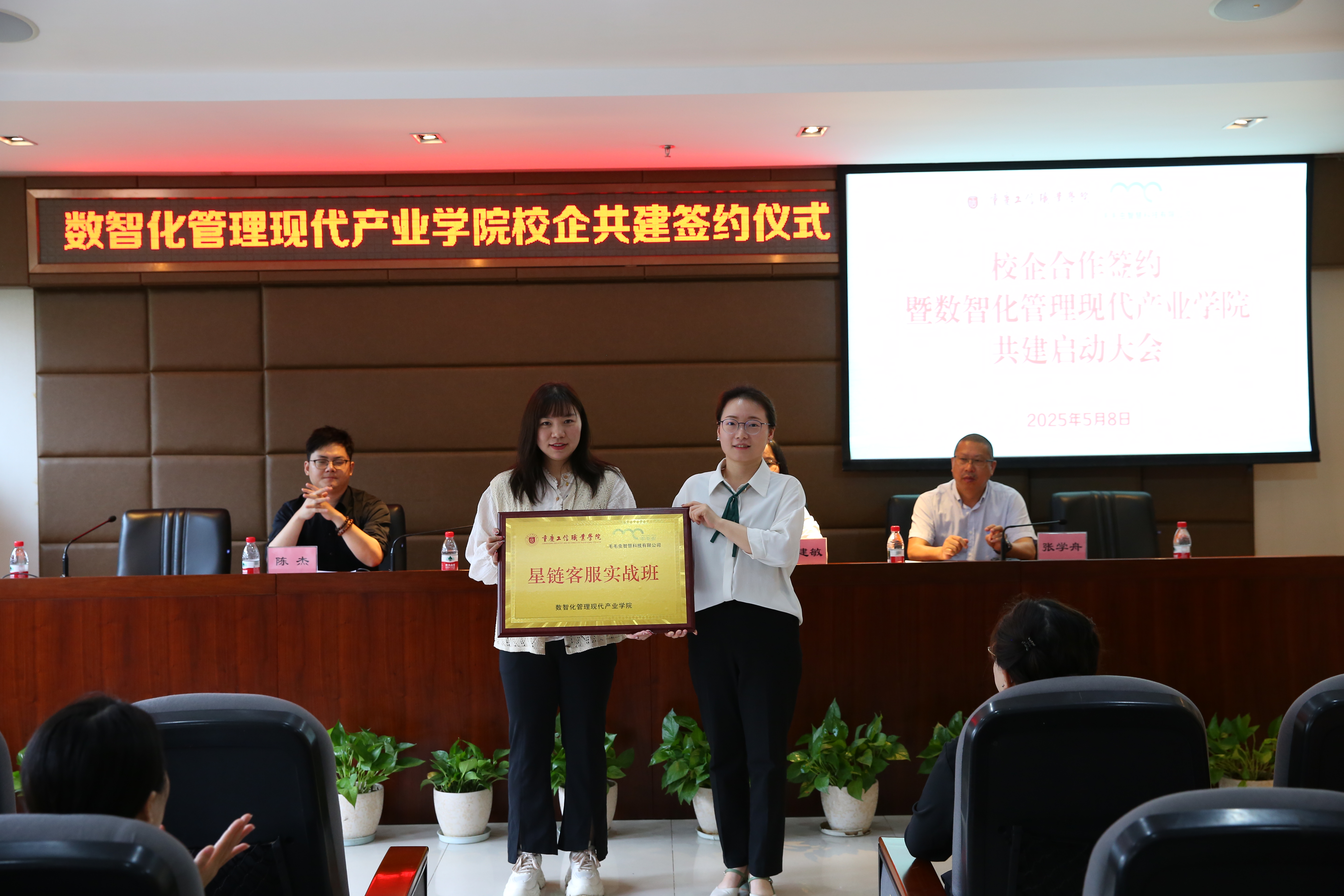 在签约仪式环节,双方正式签署校企合作协议,并举行了“班牌授予仪式”,标志着数智化管理现代产业学院共建班级正式启动。2024级网络营销专业学生代表李金瑞在现场发言,表达了对实训机会的珍惜与未来成长的坚定信心。
