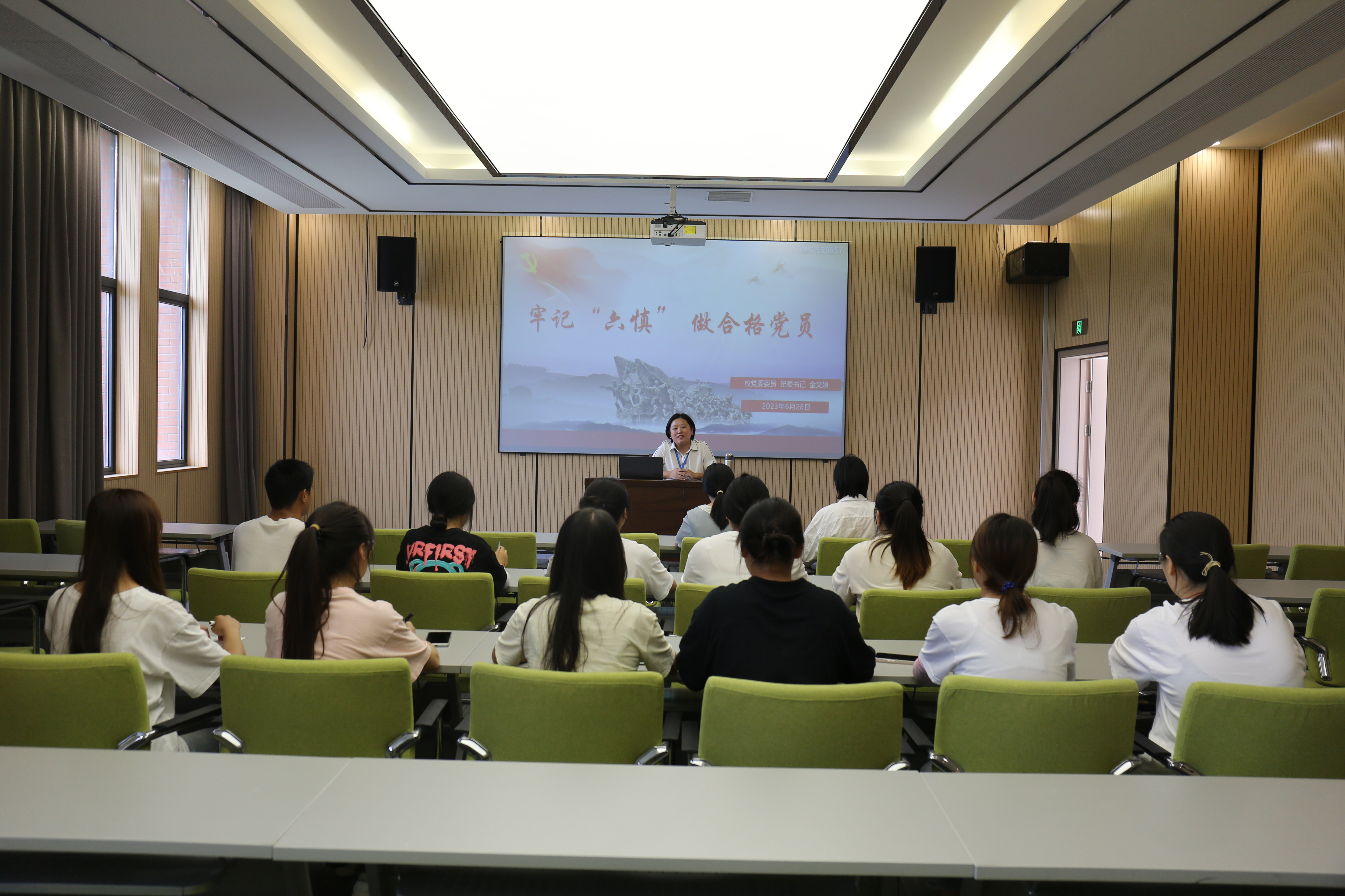 2023年6月28日,按照校领导班子讲党课的统一部署,校党委委员、纪委书记金文娟同志以《牢记“六慎”,做合格党员》为题,在现代服务学院党支部讲专题党课。现代服务学院党支部书记肖建敏主持,党支部全体教师以及各班学生代表参加了会议。